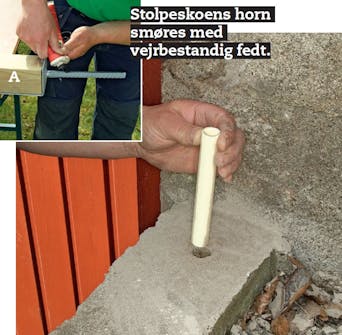 Skoene støber vi ikke fast, når vi har boret hul til dem. I den ene side klæber vi dem fast i hullerne med forankringslim. I den anden side skal rækværket kunne løftes op af hullerne, og her forer vi hullet med et plastrør, så stolpeskoens stang kan glide op af det og ned igen uden at få ødelagt sin galvanisering.