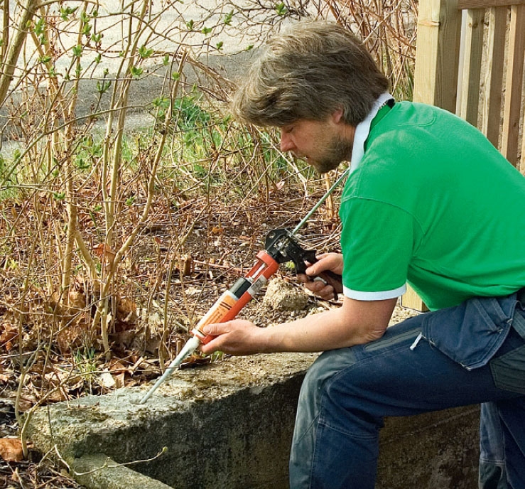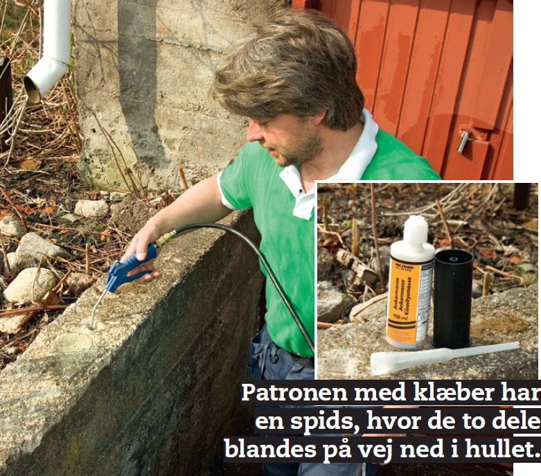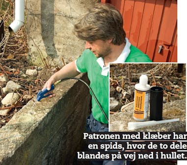I den anden side gør vi stolperne permanent fast. Her blæser vi hullerne omhyggeligt rene for støv, inden vi sætter patronen med tokomponent klæber i vores fugepistol. Du kan evt. bruge en anden type lim, bare den er beregnet på opgaven.