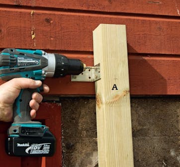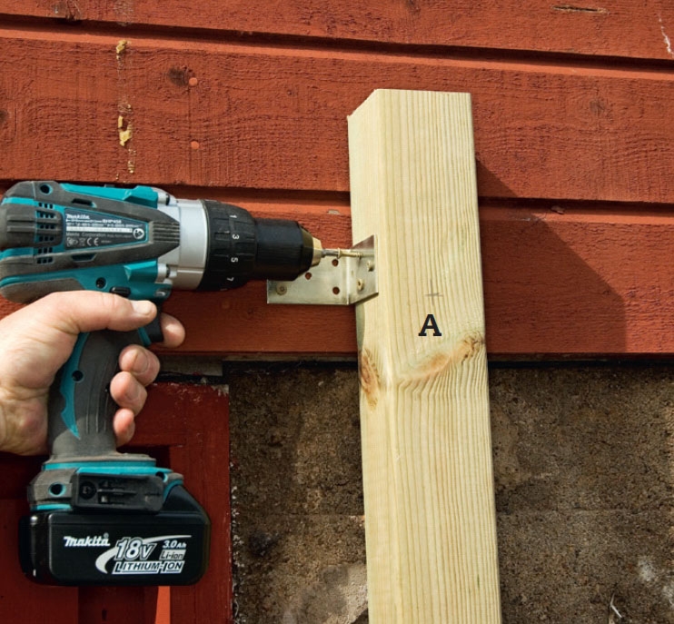 Foroven gøres stolpen (A) tættest på væggen fast i et vinkelbeslag i den side, hvor rækværket skal kunne løftes af. Sæt evt. et beslag på hver side, så rækværket blot kan klemmes på plads. I den anden side skruer vi stolpen fast med to 120 mm franske skruer.