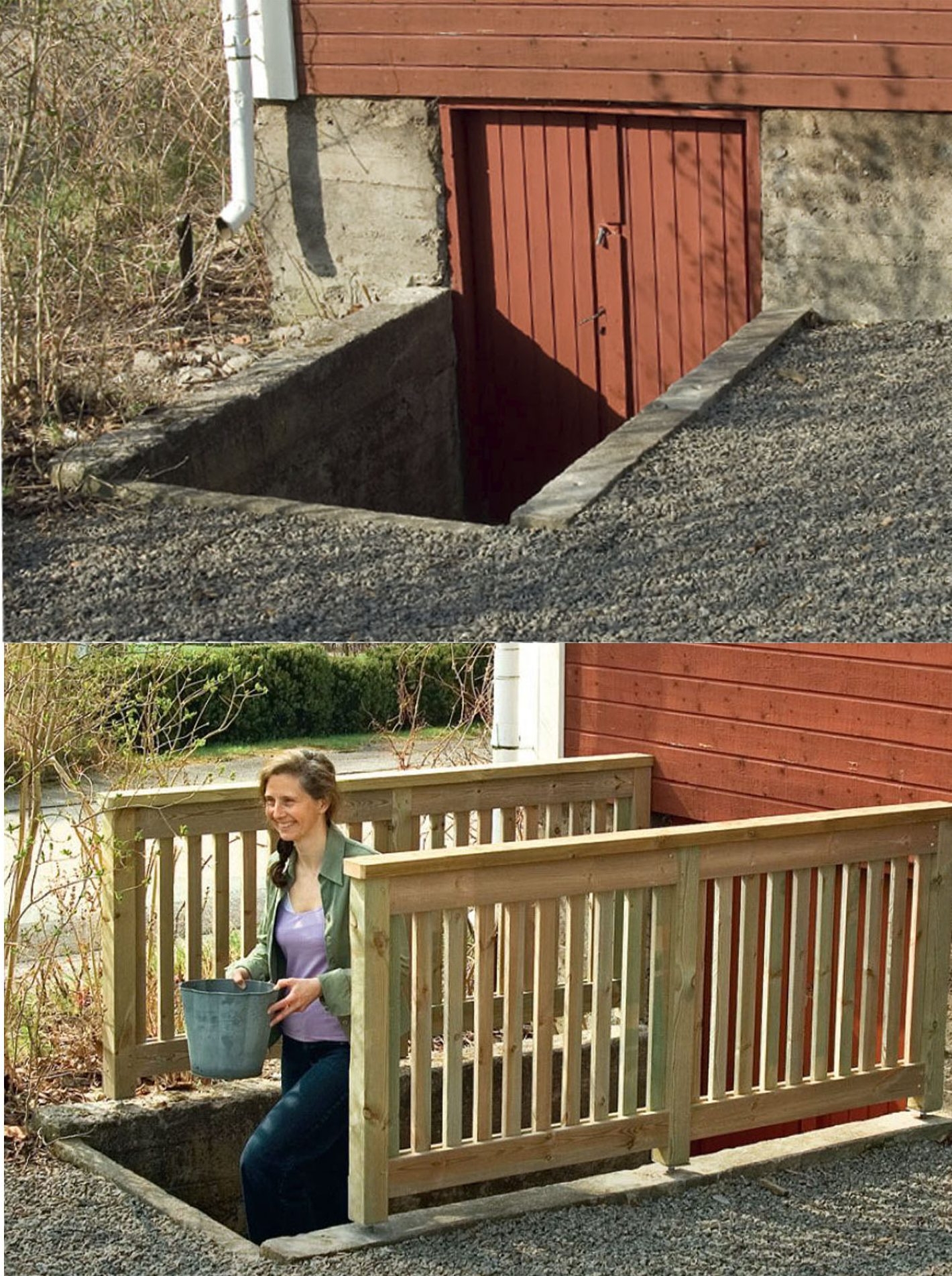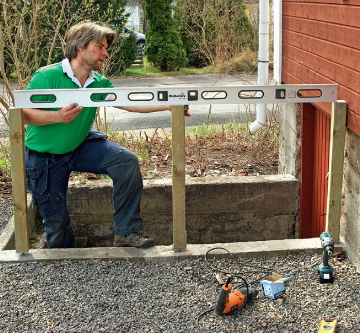Den støbte kælderskakt er hård at gøre noget fast i - til gengæld står rækværket godt og solidt, når først det står.