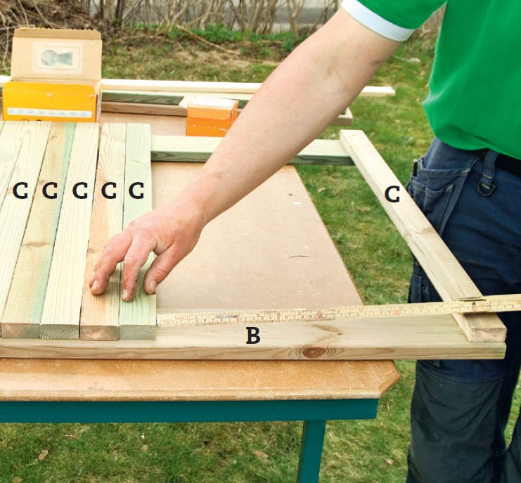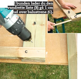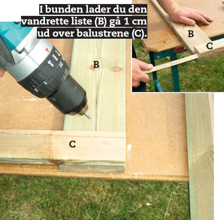 De to yderste balustre (C) skrues fast ude i enderne af en af de øverste vandrette lister (B). Vi lader kanterne flugte, og vi sætter en enkelt 4 x 55 mm skrue ved det ydre hjørne. Forneden skrues de på den vandrette liste (B) 1 cm fra dens underkant.