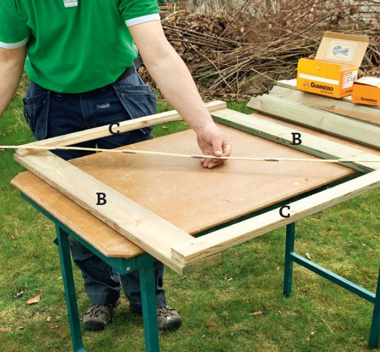 Nu har vi en ramme, som vi retter vinkelret ind og låser fast med en ekstra skrue i alle samlinger. Til at sikre, at rammen er i vinkel, bruger vi diagonalmål - når afstanden fra hjørne til hjørne er præcis ens i begge diagonaler, er rammen i vinkel.