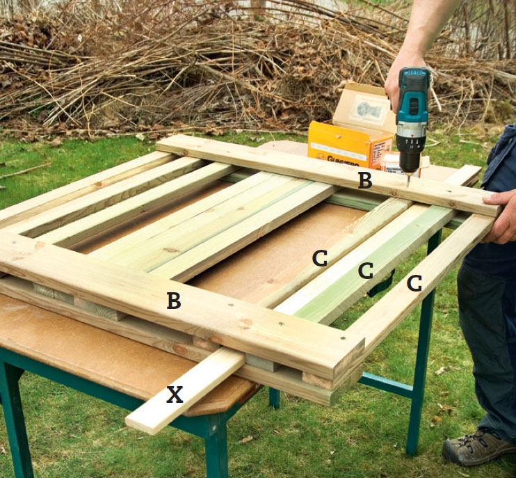 De sidste balustre (C) skrues fast. Her høvler vi en afstandsliste (X) til, så den passer med luften mellem balustrene. Inden vi skruer, gør vi de ekstra vandrette lister (B) fast i de yderste balustre, så vi skruer gennem alle tre lag på en gang.