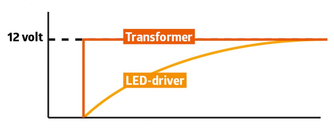 LED-spots har brug for en rolig opstart, hvor spændingen øges jævnt og kontrolleret over kort tid. Nogle elektroniske transformere øger spændingen øjeblikkeligt, og den gentagne, hårde opstart kan forkorte LED-spottets levetid.