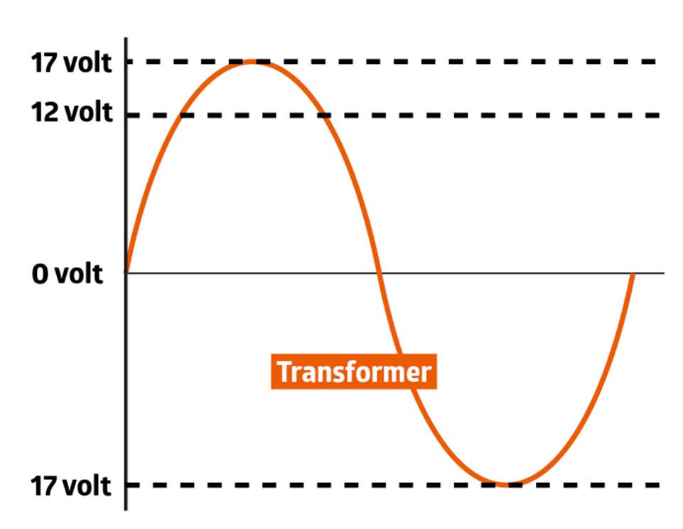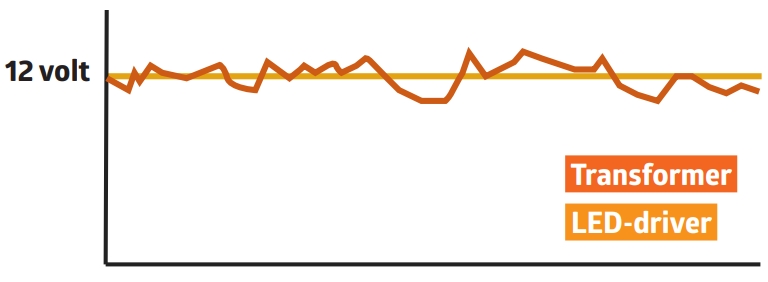 En gammeldags jernkernetransformer producerer vekselspænding, som skiftevis løber den ene og den anden vej rundt i ledningerne. Hvis transformeren har en effektiv spænding på 12 volt, er den maksimale spænding 17 volt. Sætter du et LED-spot, som altid har brug for jævnspænding, til jernkernetransformeren, vil spottet, hvis det overhovedet lyser, kun lyse, når spændingen løber den ene vej.