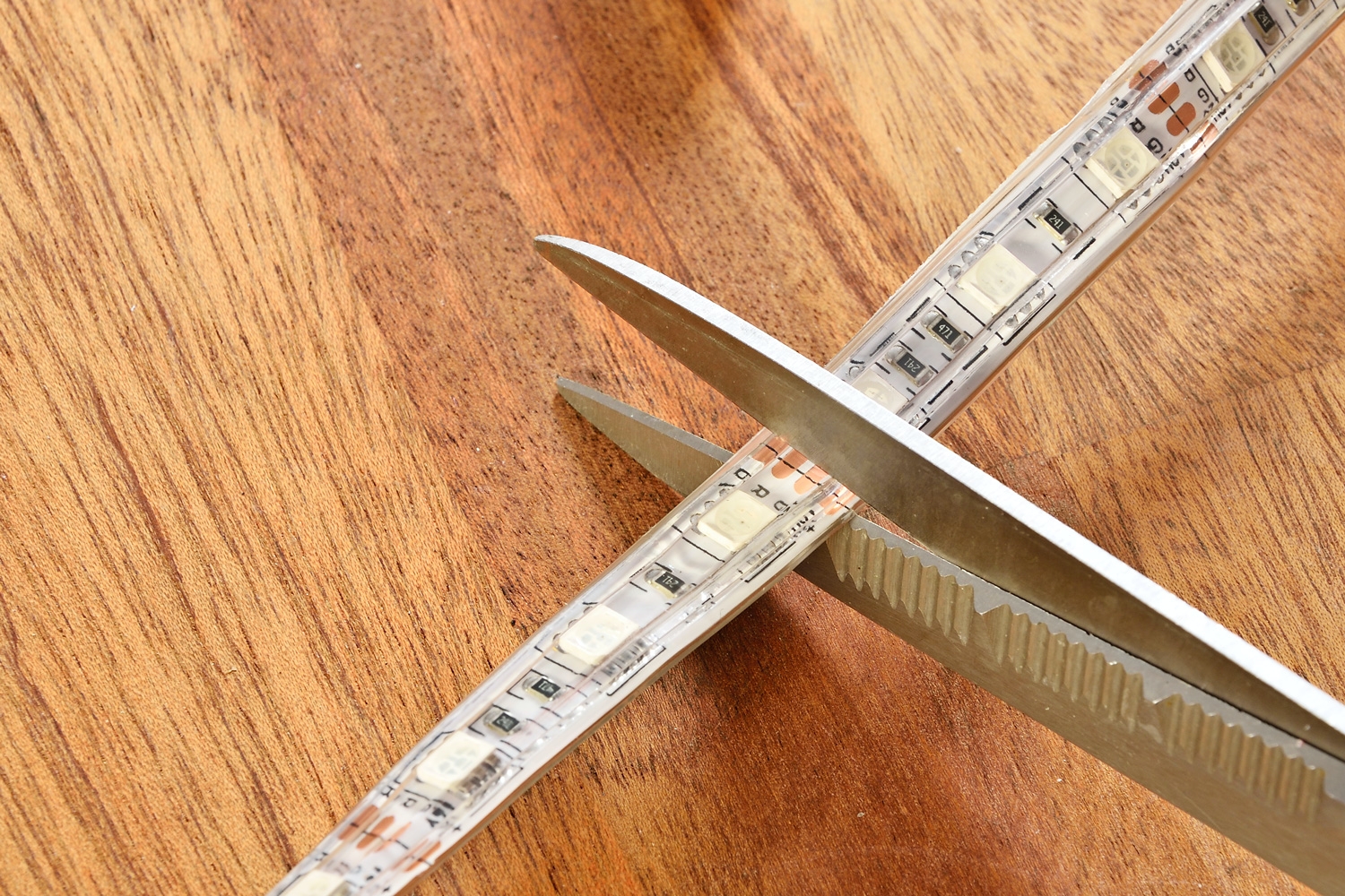 2. Klip efter stregerne. LED båndet kan afkortes for cirka hver femte centimeter. Der skal klippes præcist igennem den stiplede linje.