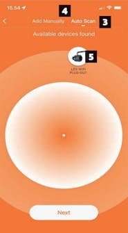 - Klik på fanebladet Auto Scan [3], og vent, indtil din enhed dukker op. Du kan også tilføje manuelt [4] ved at vælge enheden på en liste, men det er noget mere besværligt. Prøv Auto Scan igen, og flyt evt. stik og router tættere på hinanden, hvis det ikke virker første gang. Klik på dit stik [5].