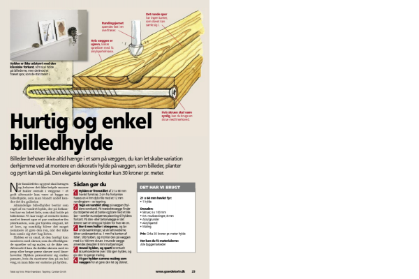 Bor 6 mm huller i stregerne, og lav undersænkninger, så skruehovederne bliver undersænket ca. 1 mm fra kanten af listen. Slib hylden, og monter den på væggen med 6 x 100 mm skruer. I murede vægge anvendes desuden 8 mm murbøsninger.