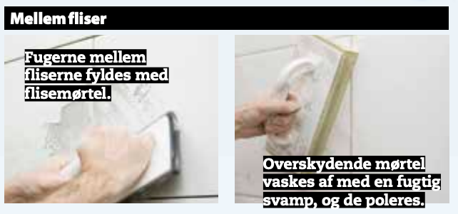 På bordet og væggene op til det klæber vi hvide fliser, der måler 33 x 45 cm. Størrelsen gør det vigtigt at få dem placeret helt rigtigt, da de få fuger ses tydeligt. Bordet brydes af en skorsten, og vi skærer fliserne til, så fire fliser mødes i et kryds midt på den resterende flade.