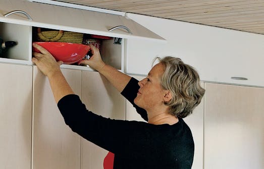 Skabene bygges af 16 mm mdf-plade som firkantede kasser, der skrues og limes sammen. De særlige fiederbelastede låge-hængsler gør, at lågen kan åbnes, selv om den går helt til loftet. Og den forbliver åben, når du slipper den.