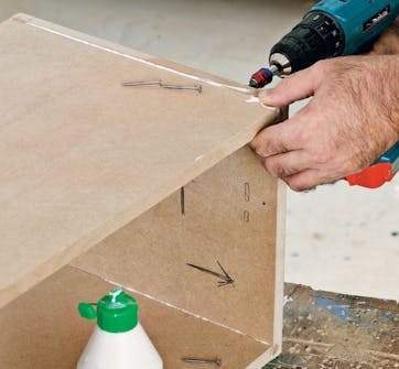 Lim og skru pladerne sammen. Brug tynde skruer, som er 3 gange længere end mdf-pladernes tykkelse. Her er brugt 3,5 x 40 mm skruer.