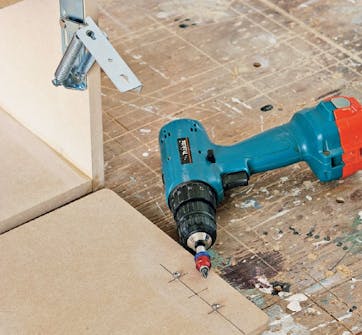 Bor for i mdf-pladerne alle vegne, hvor der skal skrues. Især i endetræet er det vigtigt, så pladerne ikke flækker. Brug et 3 mm bor til forboring, og undersænk hullerne til skruehovederne.