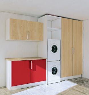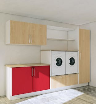Stil maskinerne op på et skuffemøbel. Det giver dels en god arbejdshøjde, dels plads til vaskemidler m.m., som ellers tager plads op et andet sted.