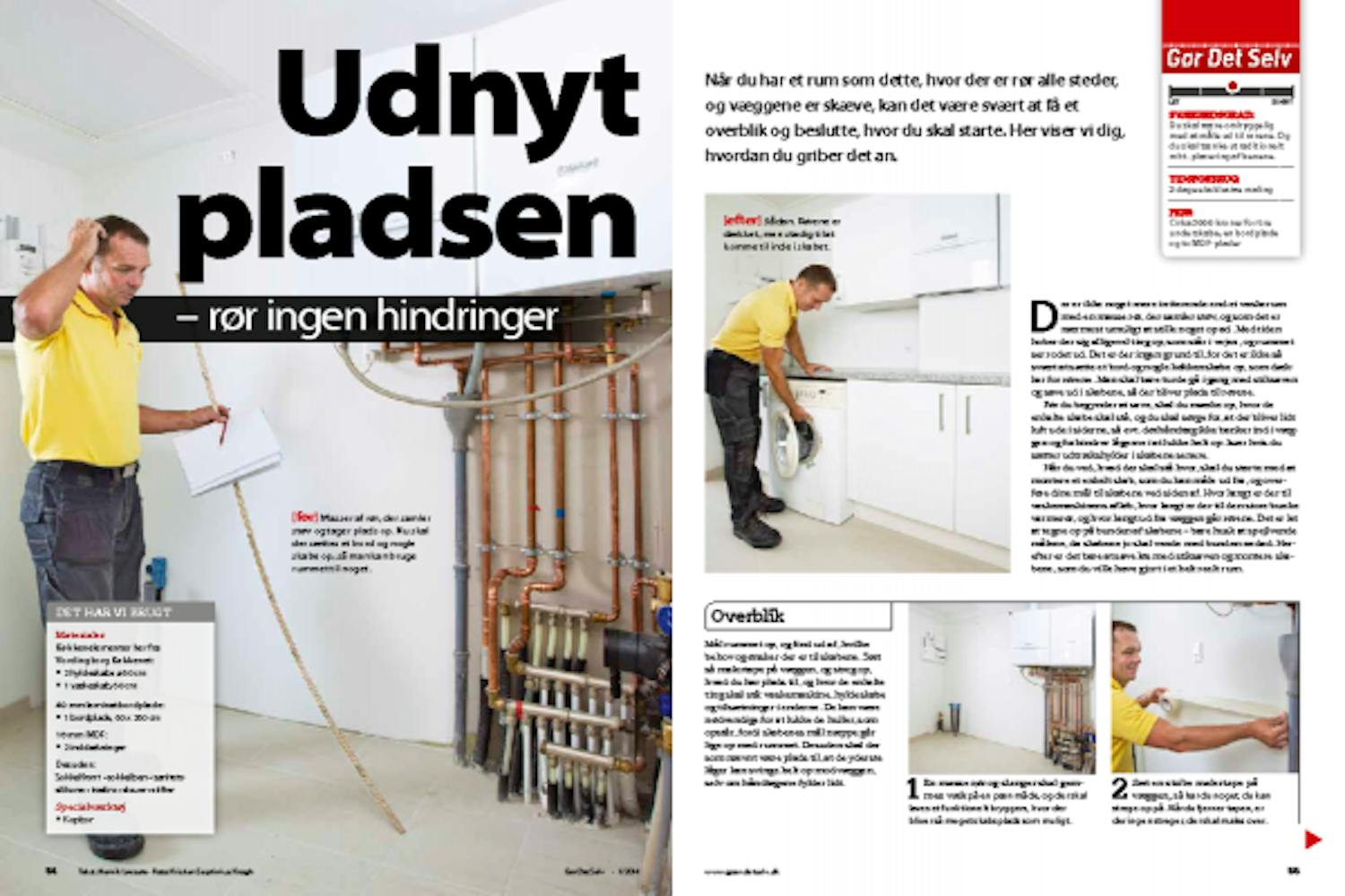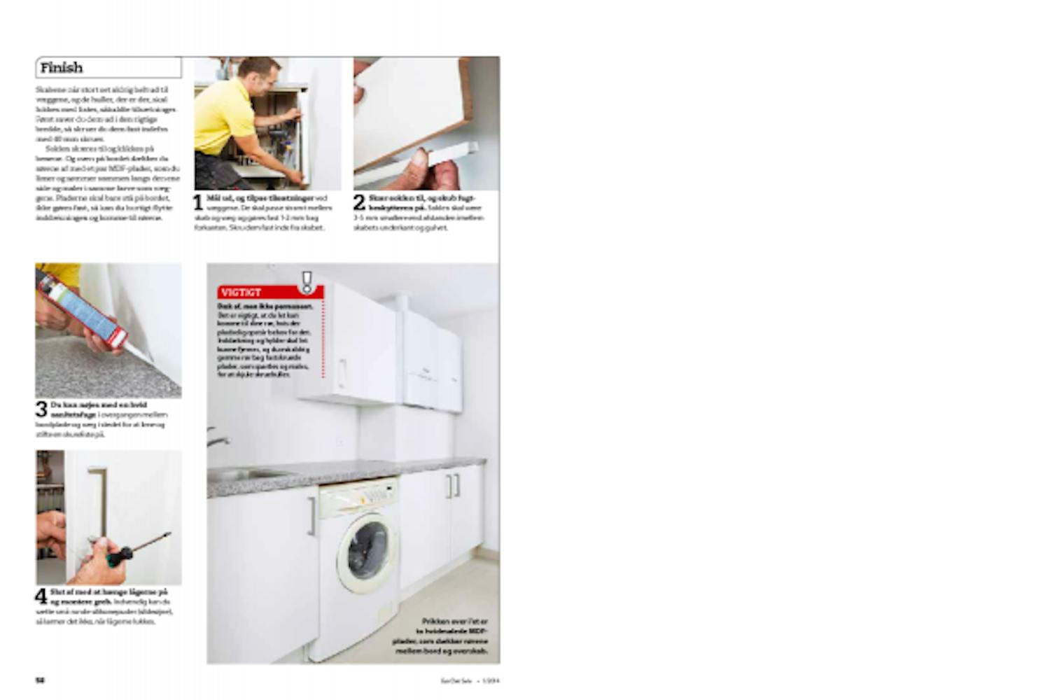 Soklen skæres til og klikkes på benene. Og oven på bordet dækker du rørene af med et par MDF-plader, som du limer og sømmer sammen langs den ene side og maler i samme farve som væggene. Pladerne skal bare stå på bordet, ikke gøres fast, så kan du hurtigt flytte inddækningen og komme til rørene.