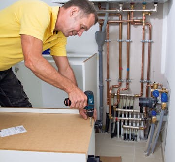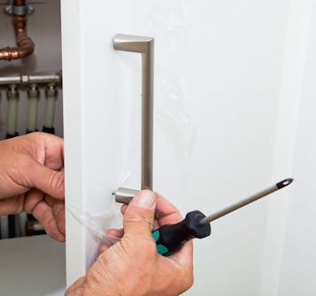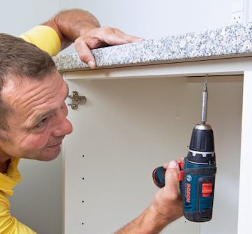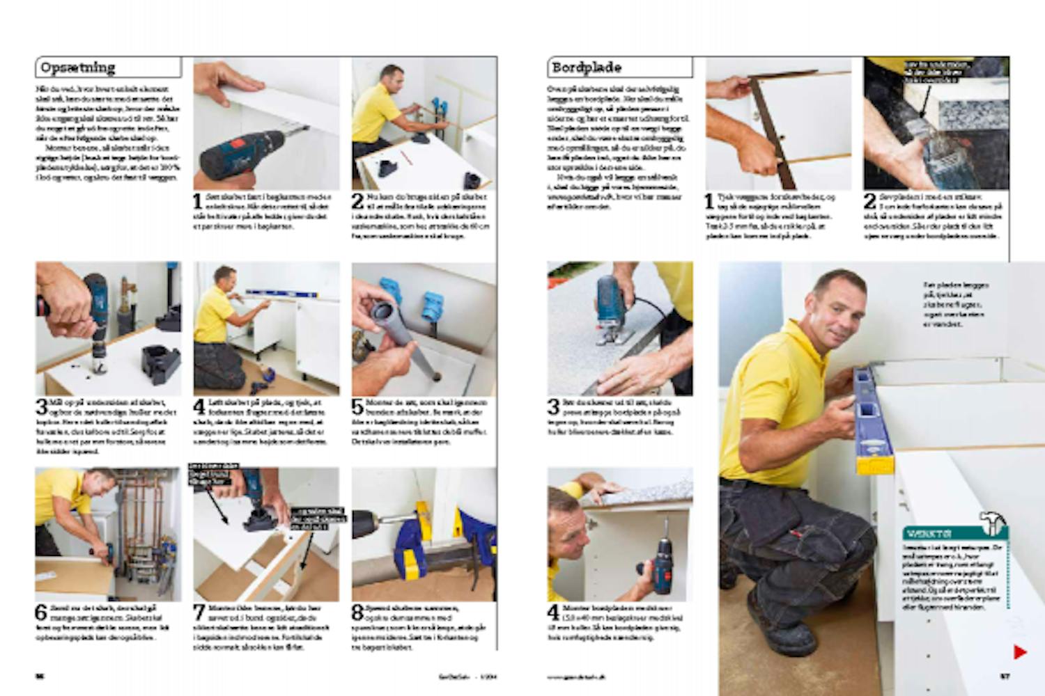 Når du ved, hvor hvert enkelt element skal stå, kan du starte med at sætte det første og letteste skab op, hvor der måske ikke engang skal skæres ud til rør. Så har du noget at gå ud fra og rette ind efter, når de efterfølgende skabe skal op.