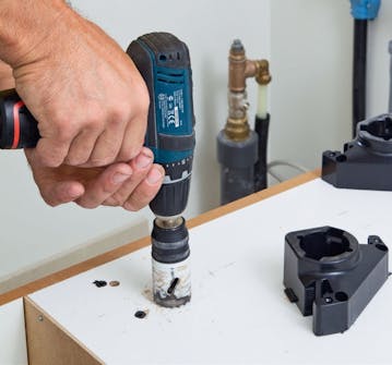 Mål op på undersiden af skabet, og bor de nødvendige huller med et kopbor. Her er det huller til vand og afløb fra vasken, du skal bore ud til. Sørg for, at hullerne er et par mm for store, så rørene ikke sidder i spænd.