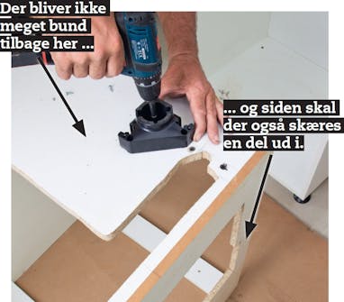 Monter ikke benene, før du har savet ud i bund og sider, da du sikkert skal sætte benene lidt utraditionelt i bagsiden ind mod rørene. Fortil skal de sidde normalt, så soklen kan få fat.