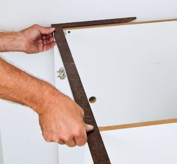 Tjek væggene for skævheder, og tag så de nøjagtige mål imellem væggene fortil og inde ved bagkanten. Træk 2-3 mm fra, så du er sikker på, at pladen kan komme ind på plads.