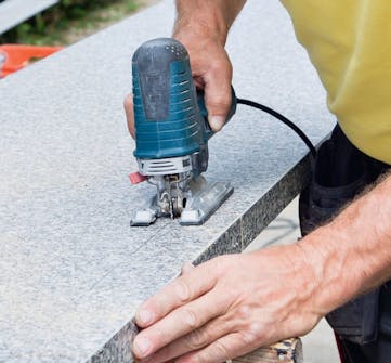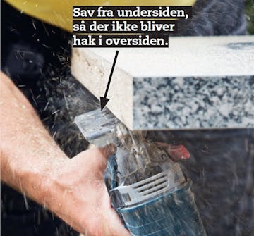 Sav pladen i med en stiksav. 5 cm inde fra forkanten kan du save på skrå, så undersiden af pladen er lidt mindre end oversiden. Så er der plads til den lidt ujævne væg under bordpladens overside.