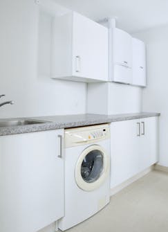 Mål rummet op, og find ud af, hvilke behov og ønsker der er til skabene. Sæt så malertape på væggen, og streg op, hvad du har plads til, og hvor de enkelte ting skal stå: vaskemaskine, hyldeskabe og tilsætninger i enderne. De kan være nødvendige for at lukke de huller, som opstår, fordi skabenes mål næppe går lige op med rummet. Desuden skal der som nævnt være plads til, at de yderste låger kan svinge helt op mod væggen, selv om håndtagene fylder lidt.
