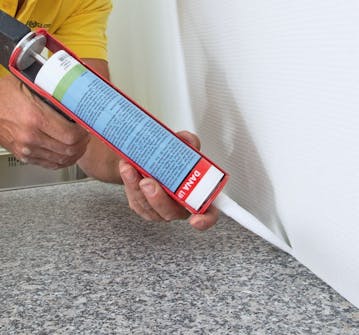 Du kan nøjes med en hvid sanitetsfuge i overgangen mellem bordplade og væg i stedet for at lime og stifte en skureliste på.