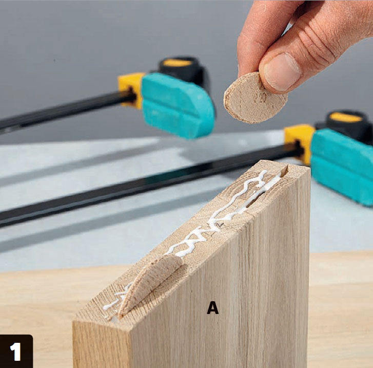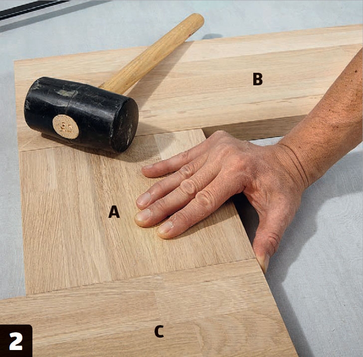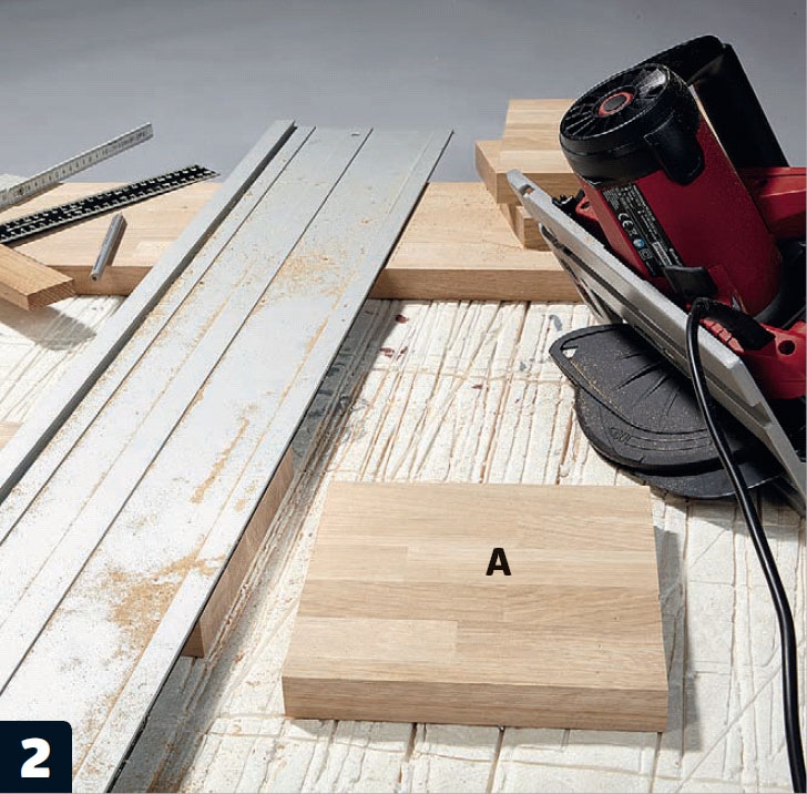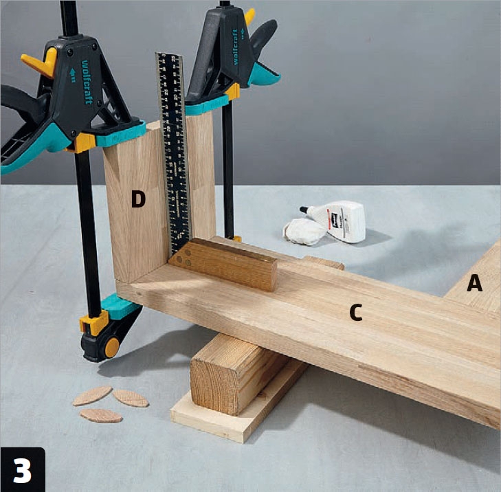 Sæt træet under pres. Med tømmervinklen sikrer vi, at de lodrette stykker (D) sidder vinkelret. Sæt træet i spænd et par timer. Størknet lim slibes væk med korn 120.