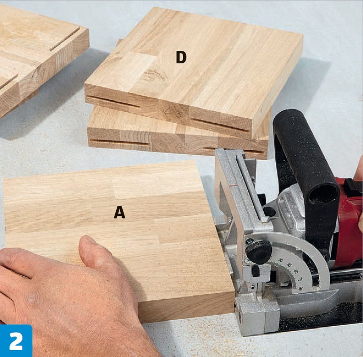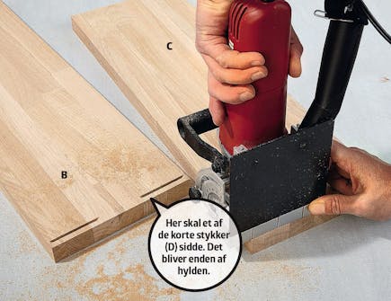 Enderne fræses. Sørg for, at træet ikke rykker sig. I endestykkerne (D) fræses kun den ene ende, mens midterstykket (A) får to spor i hver ende.