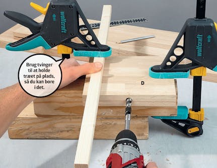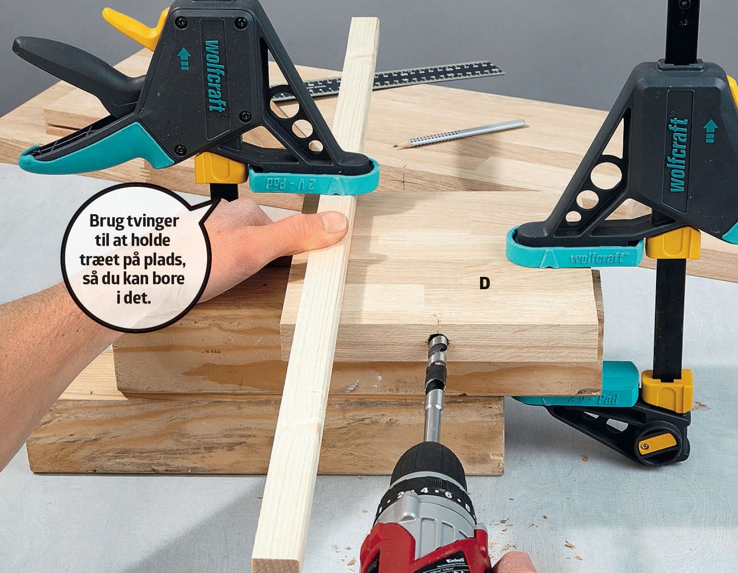 Spænd træet fast. Vi sætter en kort side (D) fast oven på noget af-faldstræ. Med et 8 mm sneglebor borer vi hul i midten af pladen.