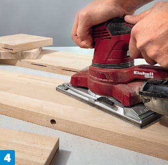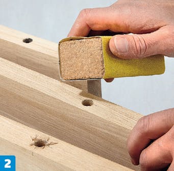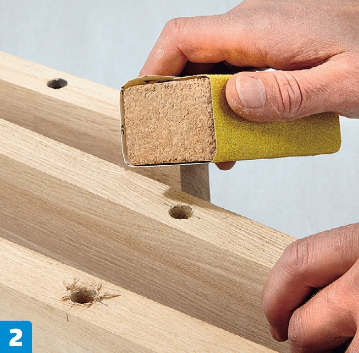 Hullerne slibes. Når alle hullerne er boret, slibes det flossede træ. Brug en slibeklods med korn 80. Blæs alle huller rene for savsmuld, støv og spåner.