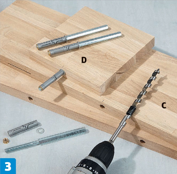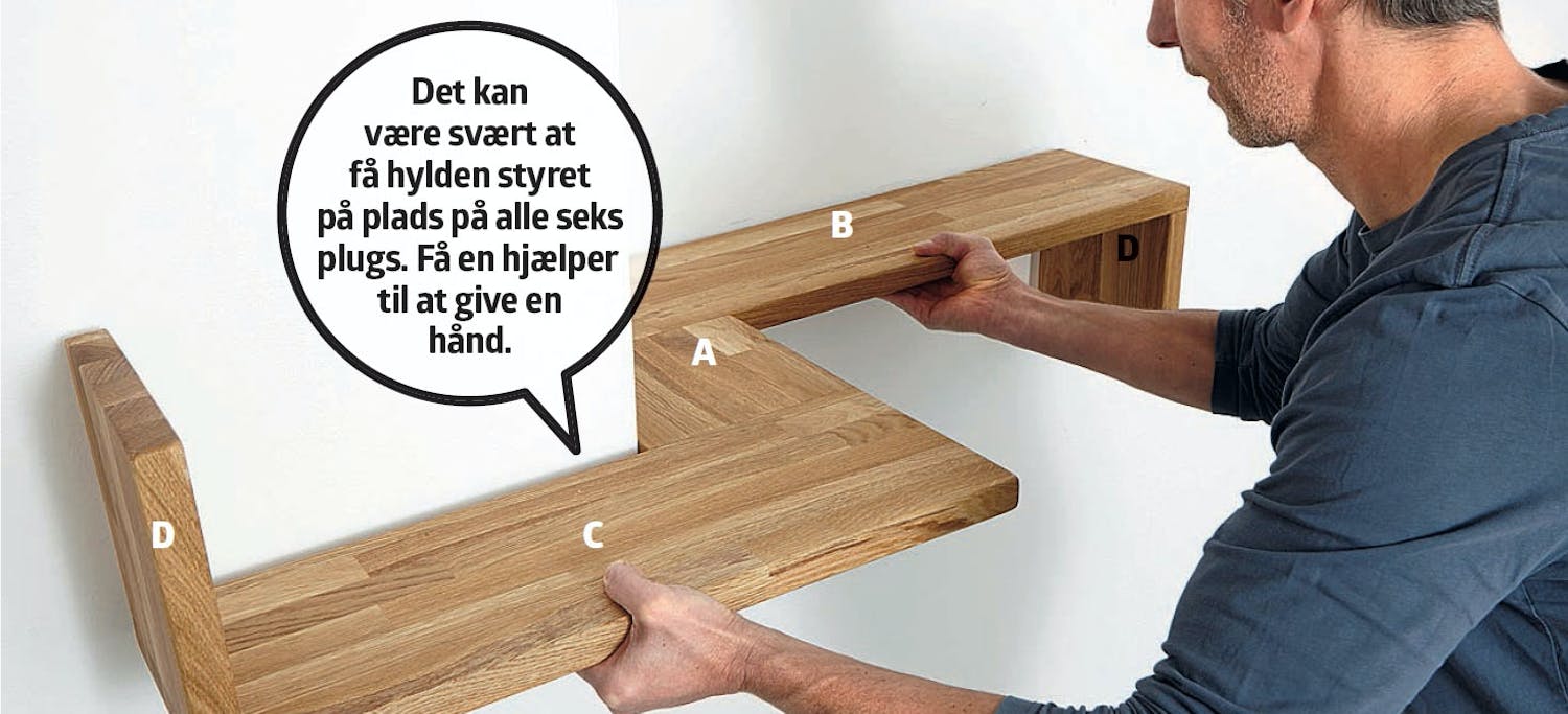 Når olien er tør, skal hylden hænges op. Først mærker vi op til ophænget. Brug et vaterpas, når du skal hænge op. Metalgevindet skrues fast i plastikpluggen, og på den måde ekspanderer pluggen i hullet. Når alle plugs er på plads, kan du hænge hylden op. Vi bruger i alt seks plugs til at sætte hylden fast. To i de lange stykker (B + C) og én i hver af de korte endestykker (D).