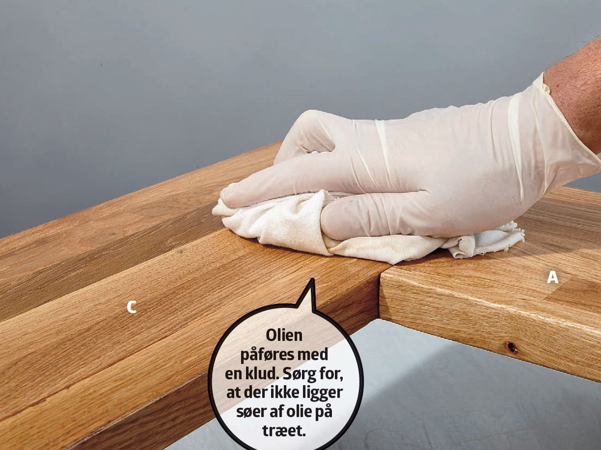 Tør overskydende lim væk med det samme. Når limen har sat sig, får hylden to lag linolie.