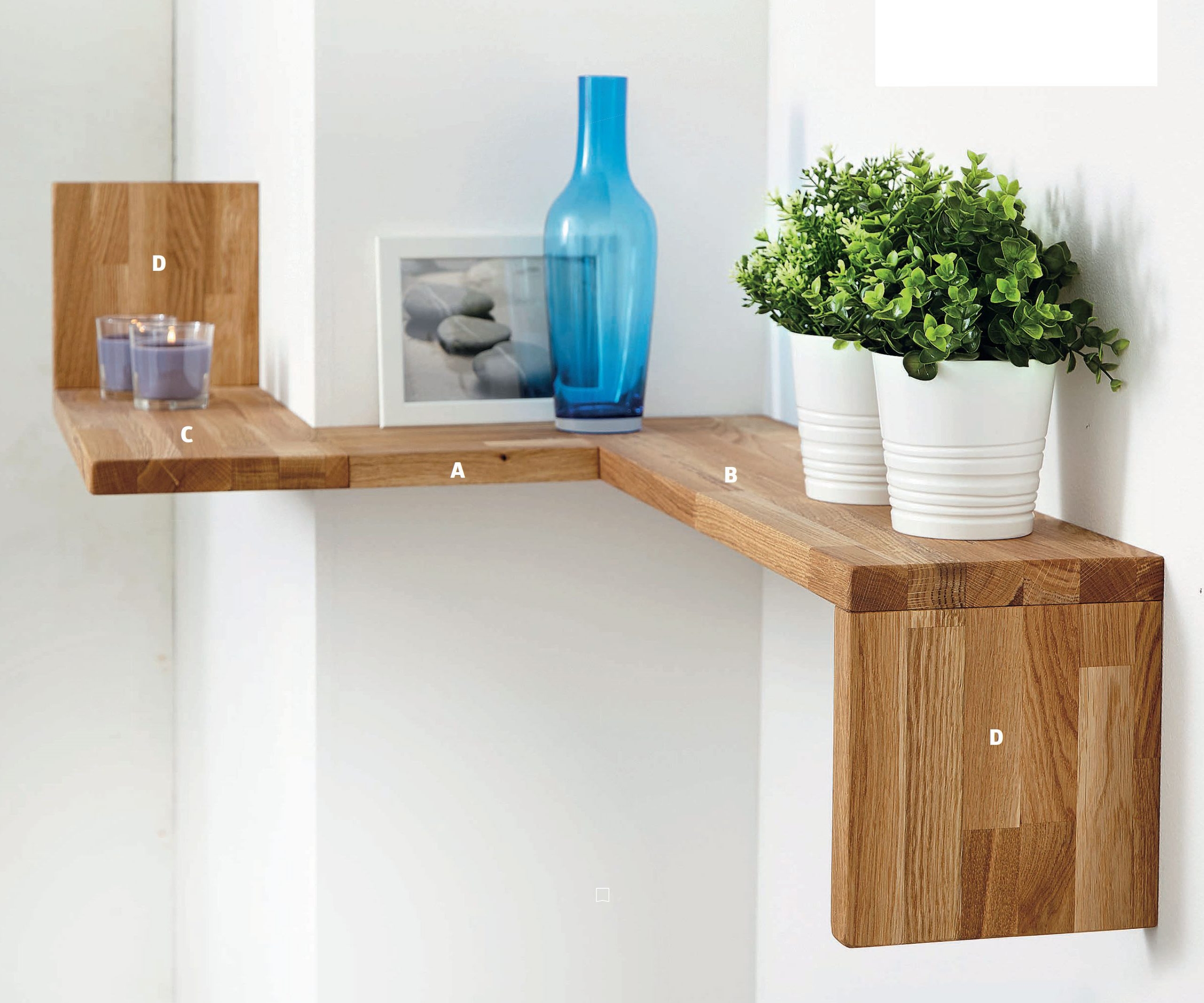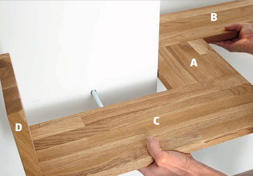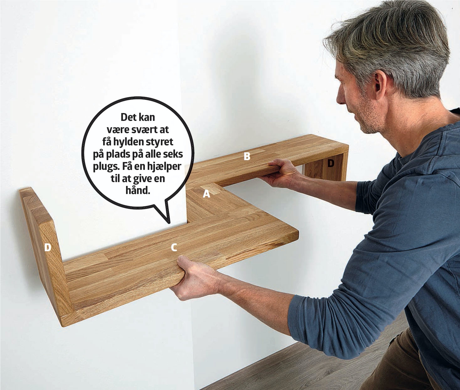 Sæt hylden sammen. To af de korte stykker (D) i enderne fastgøres lodret på de lange stykker (B og C). De to lange stykker forbindes med et kort (A). Nemt og smart.