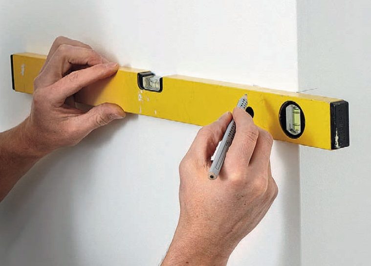 Placeringen markeres. Vi tegner op på væggen, hvor hylden skal hænge. Vi bruger et vaterpas som lineal, når vi streger op.