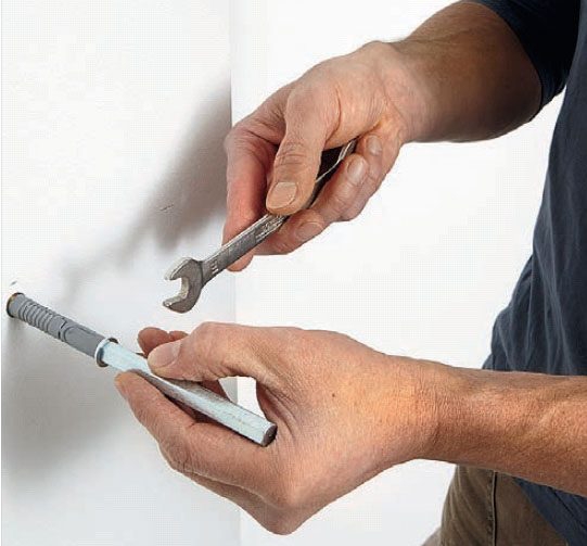 Nu pakker vi fiskemaskinen væk og finder boremaskinen og slibemaskinen frem. I byggemarkedet findes der forskellige løsninger til skjult ophæng. Det er ikke sikkert, du kan finde præcis den variant af lange plugs, som vi bruger, men den kan købes på nettet, eller du kan bruge andre udgaver.