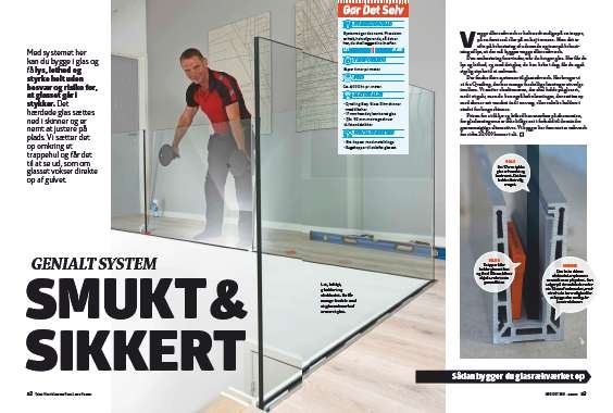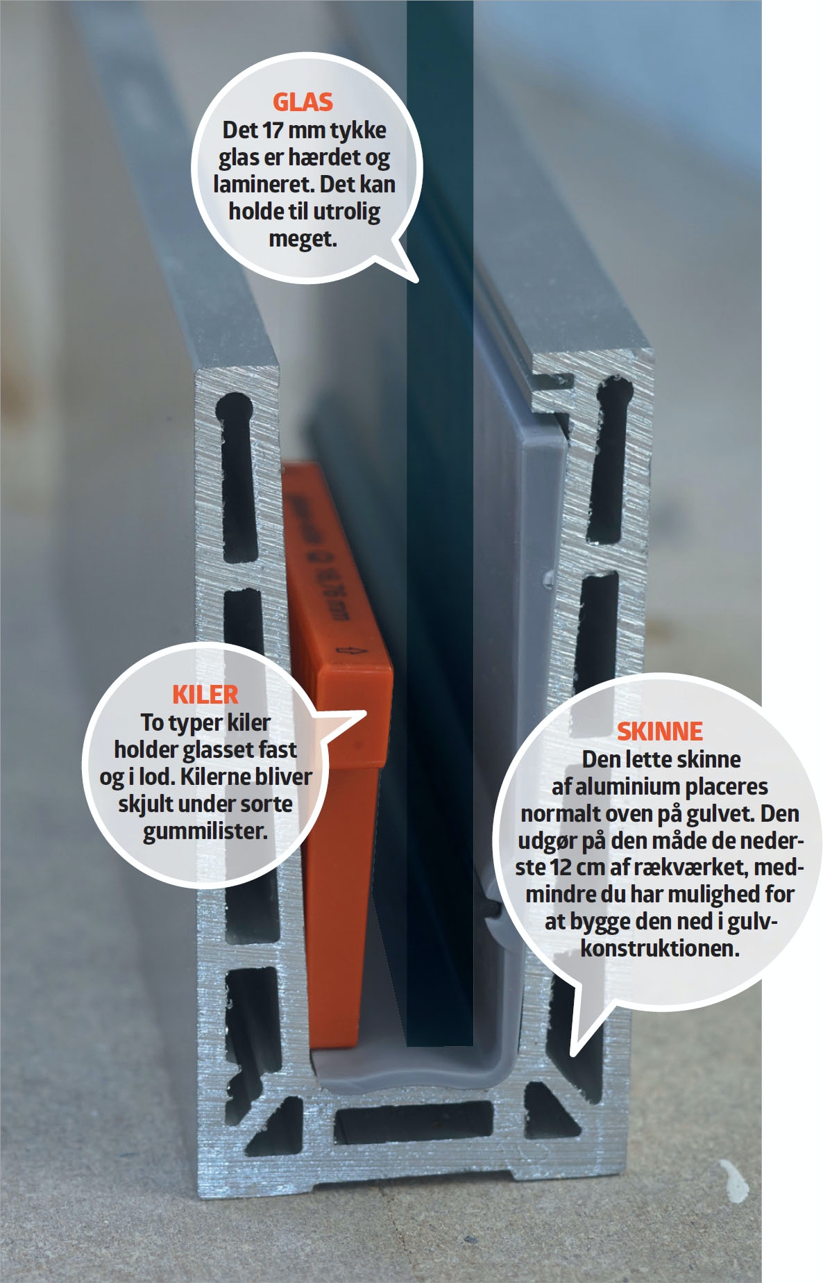 Sørg for, at skinnerne sidder solidt fast. De bliver udsat for et stort vrid, når glaspladerne kommer op, så der skal (lange) skruer i alle huller.