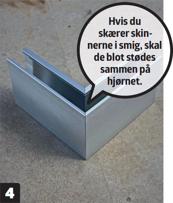Hjørner: Du kan vælge at skære skinnerne i smig, hvor de mødes i et hjørne, eller at købe færdige hjørner. Så skal du kun skære skinnerne i de rette længder.