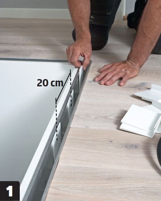 Sæt de hvide kiler på plads. De skal sidde med 20 cm’s mellemrum, altid 5 cm fra enden af skinnen og fra enden af glasset de steder, hvor glas mødes.