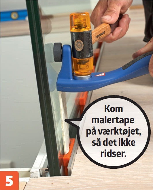 Tjek, at glasset står i lod. Du kan om nødvendigt finjustere med en tynd afstandsbrik klemt inde imellem bundskinnen og de orange kiler.
