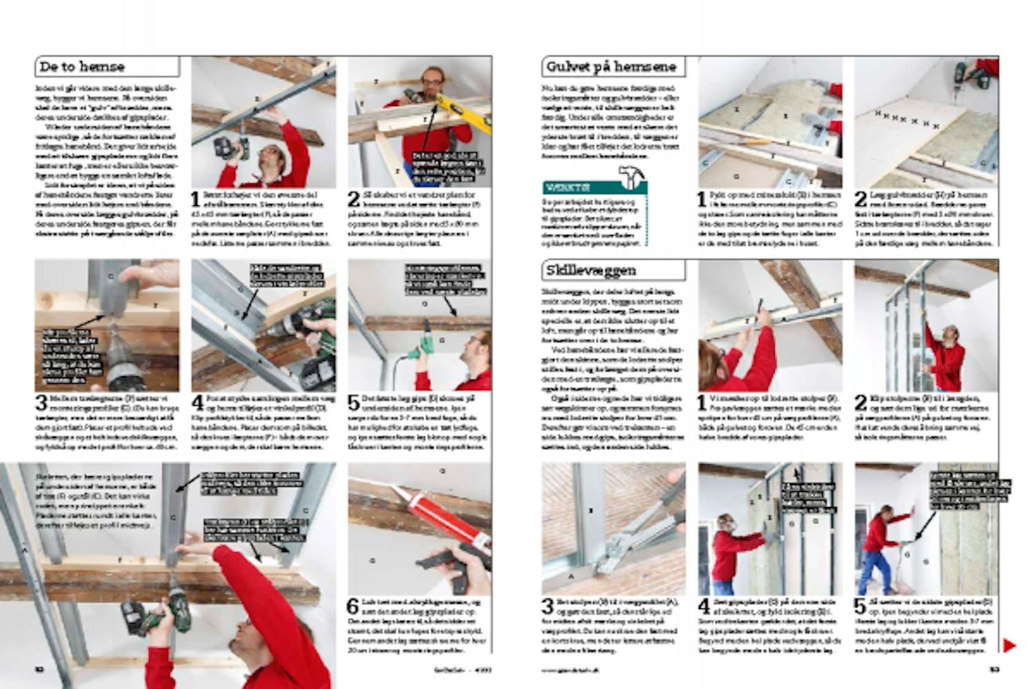 Den bygges efter samme princip som den store skillevæg: Rammen etableres af vægskinner med skumbagside, og derefter fyldes den med lodrette stolper for hver 45 cm, så de 90 cm brede gipsplader kan gøres fast i kanten og i midterlinjen.