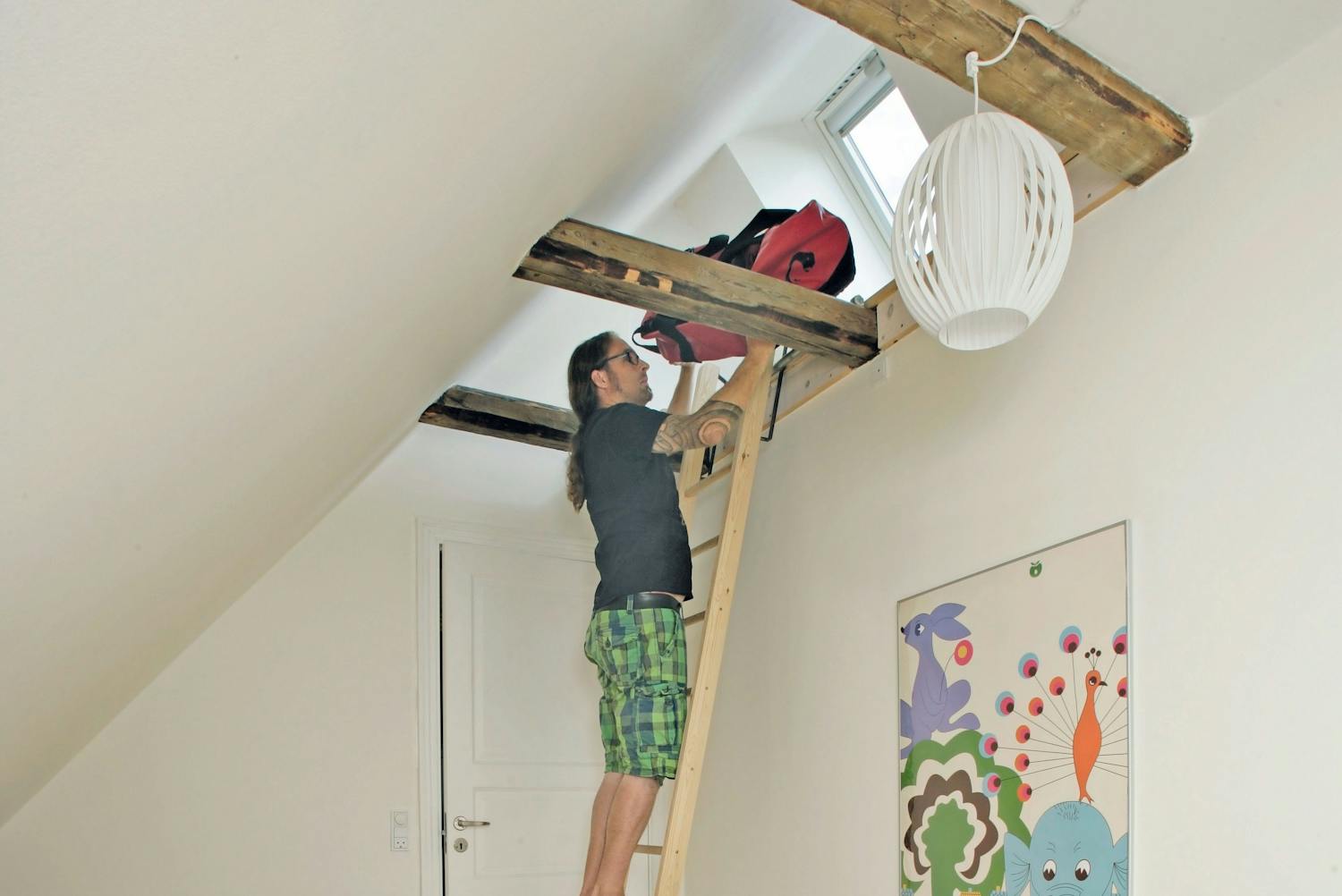 Lidt forsimplet er ideen, at vi på siden af hanebåndene fastgør vandrette lister med oversiden lidt højere end båndene. På deres overside lægges gulvbrædder, på deres underside fastgøres gipsen, der får ekstra støtte på tværgående stålprofiler.