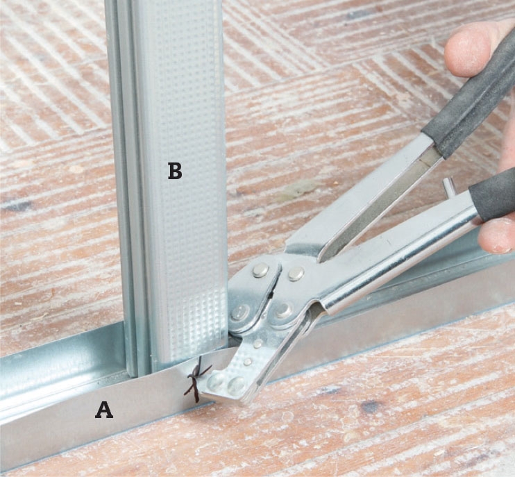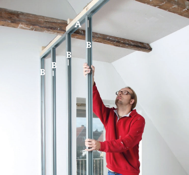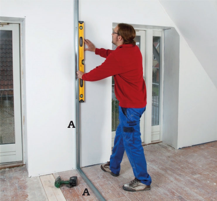 Rammen på skillevæggen sættes op som det første, her bruges vægskinner (A). Vi begynder med skinnen på gulvet, der lægges lodret under kippen, men rettes ind efter brædderne, før den skrues fast. I begge ender skrues en lodret vægskinne fast.