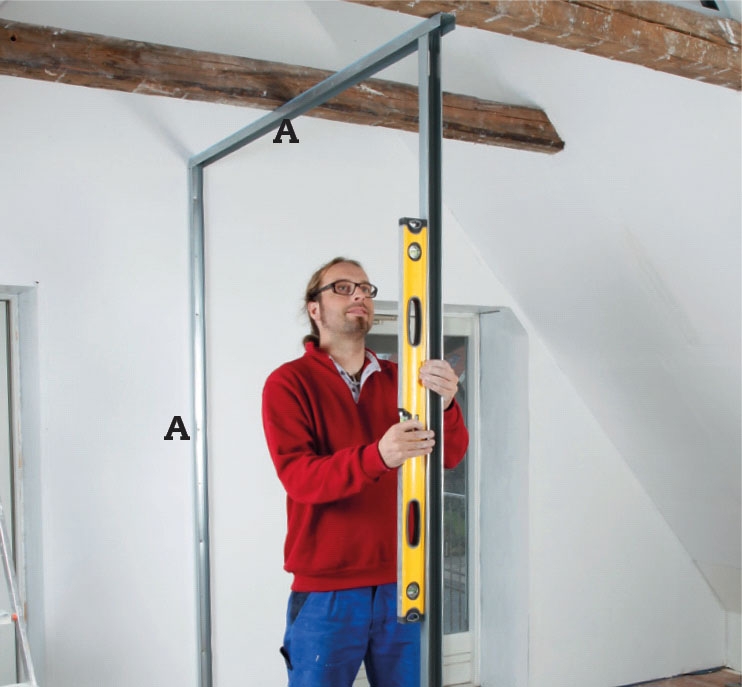 Rammen om den trekantede væg bygges af vægskinner (A). Skru først en vægskinne fast midt oven på hanebåndet. Hold derefter de næste to vægskinner mod skråvæggene. Når de er i lod, skrues de fast.