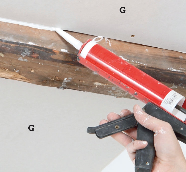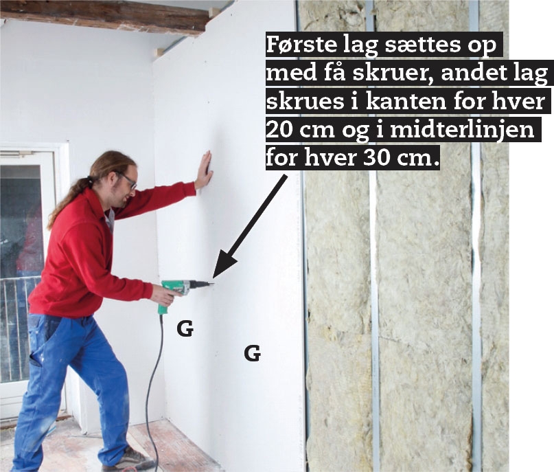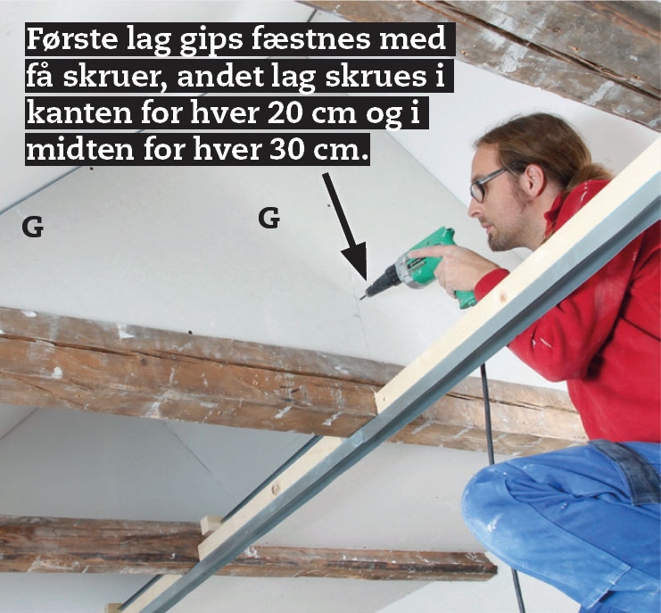 Skru gipsplader (G) på den ene side af trekanten. Det første lag skæres, så det får en 5-7 mm bred sprække ud mod skråvægge og hanebånd, så du kan lukke tæt til med akrylfugemasse som værn mod støj. Andet lag sættes en halv plade forskudt.