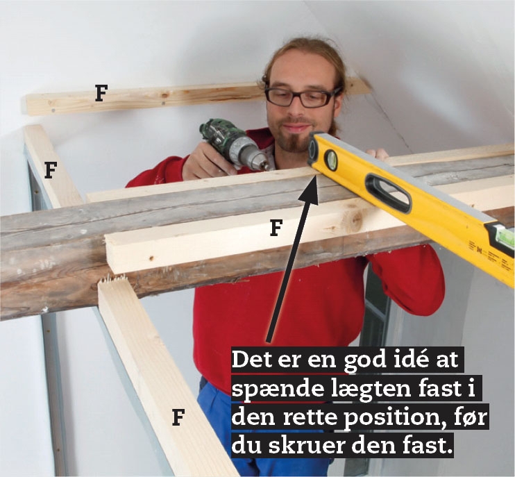 Så skaber vi et vandret plan for hemsene ved at sætte trælægter (F) på siderne. Find det højeste hanebånd, og sæt en lægte på siden med 5 x 80 mm skruer. Alle de øvrige lægter placeres i samme niveau og skrues fast.