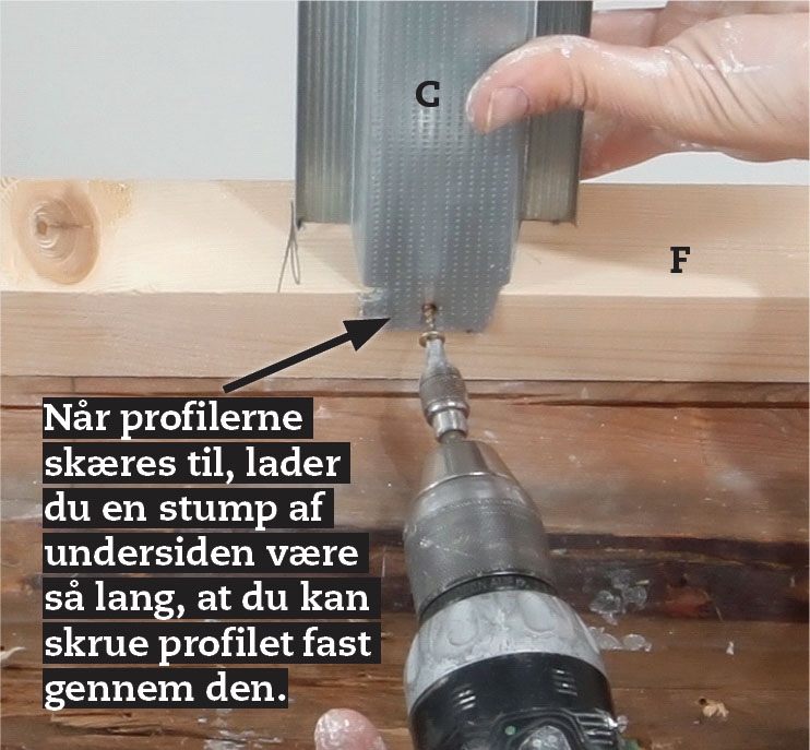 Stålprofilet C) støtter pladen midtvejs, så den ikke kommer til at hænge med tiden. Trælægten (F) og stålprofilet (C) her har samme funktion: De skal bære gipspladen i kanten.