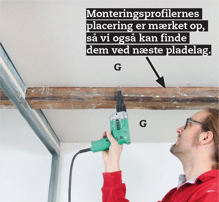 Det første lag gips (G) skrues på undersiden af hemsene. Igen sørger du for en 5-7 mm bred fuge, så du har mulighed for at skabe en tæt lydfuge, og igen sættes første lag blot op med nogle få skruer i kanten og monteringsprof lerne.