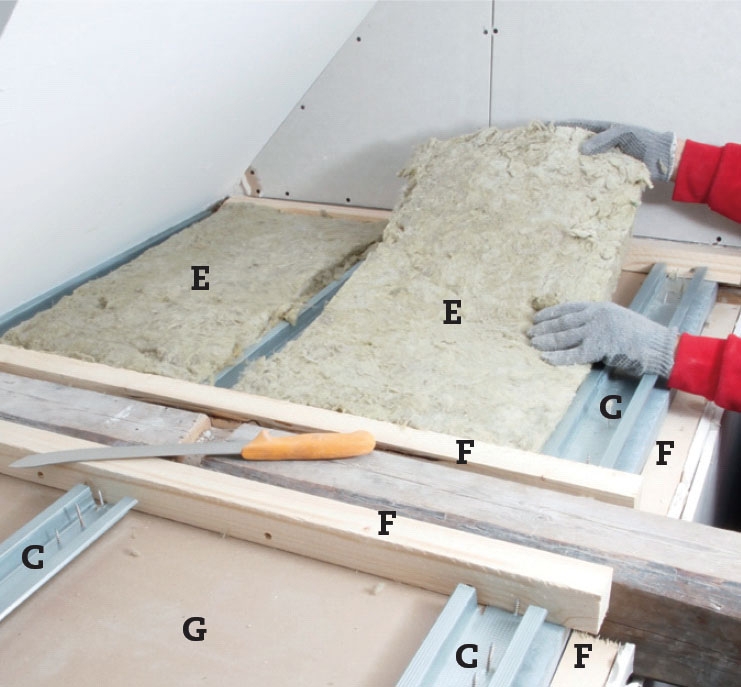 Fyld op med mineraluld (E) i hemsen i felterne mellem monteringsprof ler (C) og strøer. Som varmeisolering har måtterne ikke den store betydning, men sammen med de to lag gips og de tætte fuger i alle kanter er de med til at bremse lydene i huset.