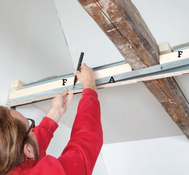 Først forhøjer vi den øverste del af stålrammen. Skær stykker af dine 45 x 45 mm trælægter (F), så de passer mellem hanebåndene. Gør stykkerne fast på de øverste væglister (A) med gipsskruer nedefra. Listerne passer sammen i bredden.
