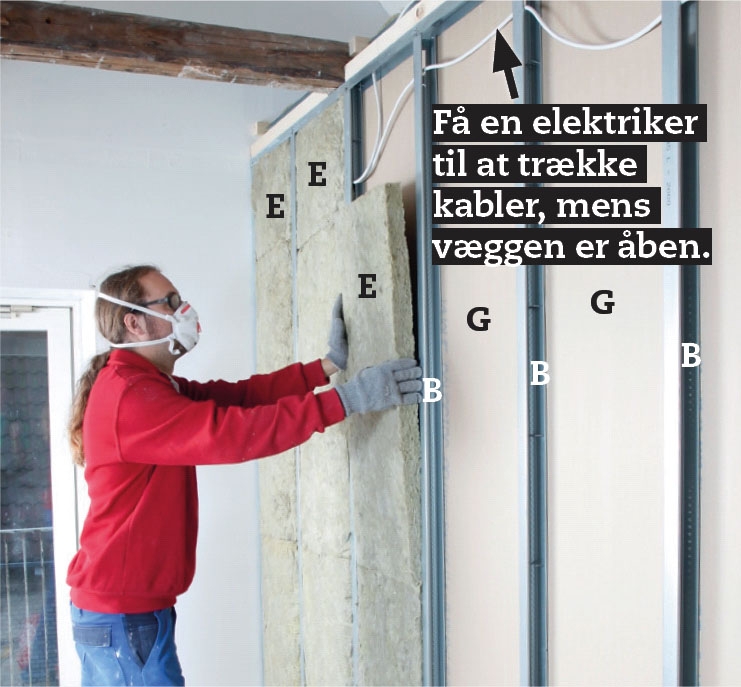 Sæt gipsplader (G) på den ene side af skelettet, og fyld isolering (E) i. Som ved trekanten gælder det, at det første lag gipsplader sættes med nogle få skruer. Begynd med en hel plade ved væggen, så du kan begynde med en halv i det yderste lag.