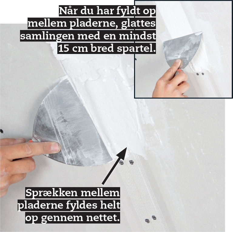 Kom rigeligt med spartelmasse over samlingen. Pres den grundigt ned gennem nettet, ind mellem pladerne. Fyld efter, og træk massen glat med en bred spartel. Lad den hærde, skrab knolde væk med spartlen, og gentag processen.